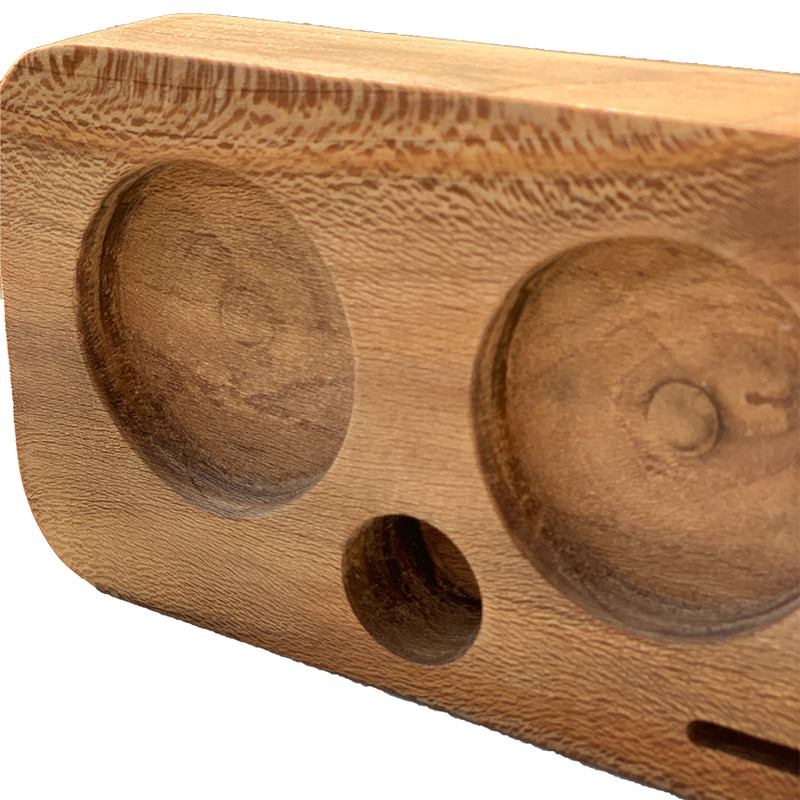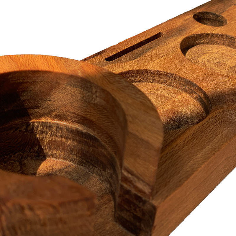استند پرتافیلتر چوب چنار یک انتخاب حرفهای و خاص برای باریستاهایی است که به نظم، زیبایی و کیفیت اهمیت میدهند. این محصول با طراحی مهندسیشده و ظاهری مینیمال، امکان سازماندهی کامل ابزارهای ضروری تهیه قهوه را فراهم میکند. در قسمت چپ استند، جایگاه U شکل مخصوص دسته پرتافیلتر سایز 51 طراحی شده که بهصورت دقیق ابزار را در موقعیت ثابت نگه میدارد. در کنار آن، چهار حفره با قطر 3 سانتیمتر تعبیه شده که بهصورت چندمنظوره قابل استفاده هستند: برای نگهداری تمپر، لولر، پاک اسکرین و فرچه تمیزکننده. همچنین یک شیار باریک جهت قراردادن استیرر یا کارتهای اندازهگیری نیز روی بدنه قرار دارد. این استند ضمن افزایش بهرهوری در فرآیند تهیه قهوه، به میز باریستا ظاهری حرفهای و چشمنواز میدهد. مناسب برای باریستاهای خانگی، کافیشاپها و هر کسی که برای ابزار کار خود ارزش قائل است.