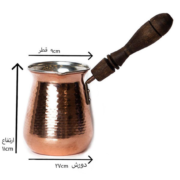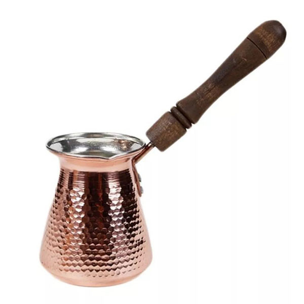 این قهوه جوش دسته دار برای قهوه فرانسوی به خصوص قهوه ترک بسیار مناسب و طمع قهوه را در آن بسیار عالی می کند و دسته این قهوه جوش از چوب است که شما موقع به جوش آمدن قهوه مجبور نیستید از دستگیره استفاده کنید و جنس این قهوه جوش از مس مرغوب است و رنگ آن ثابت است که در سه سایز کوچک، متوسط و بزرگ موجود است و ارتفاع آن حدود 9.5 سانتی متر و وزن آن 120 گرم و قطر آن حدود 6.5 سانتیمتر می باشد